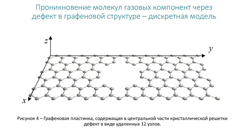 Проникновение молекул газовых компонент черездефект в графеновой структуре – дискретная модель