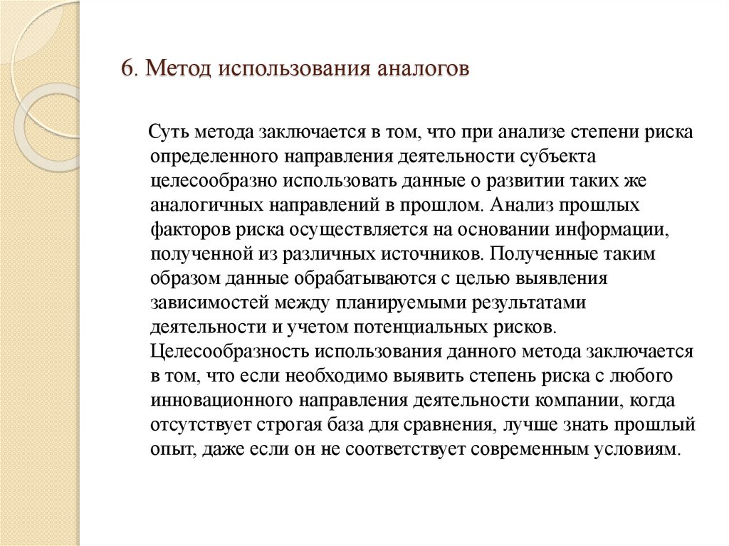 6. Метод использования аналоговСуть метода заключается в том, что при анализе степени риска