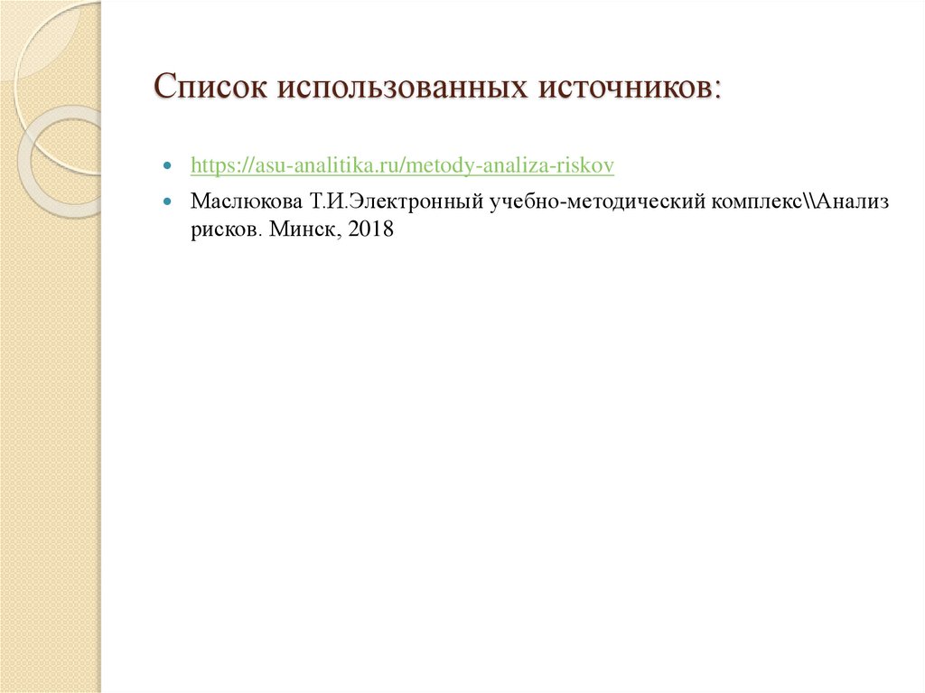 Список использованных источников:https://asu-analitika.ru/metody-analiza-riskov