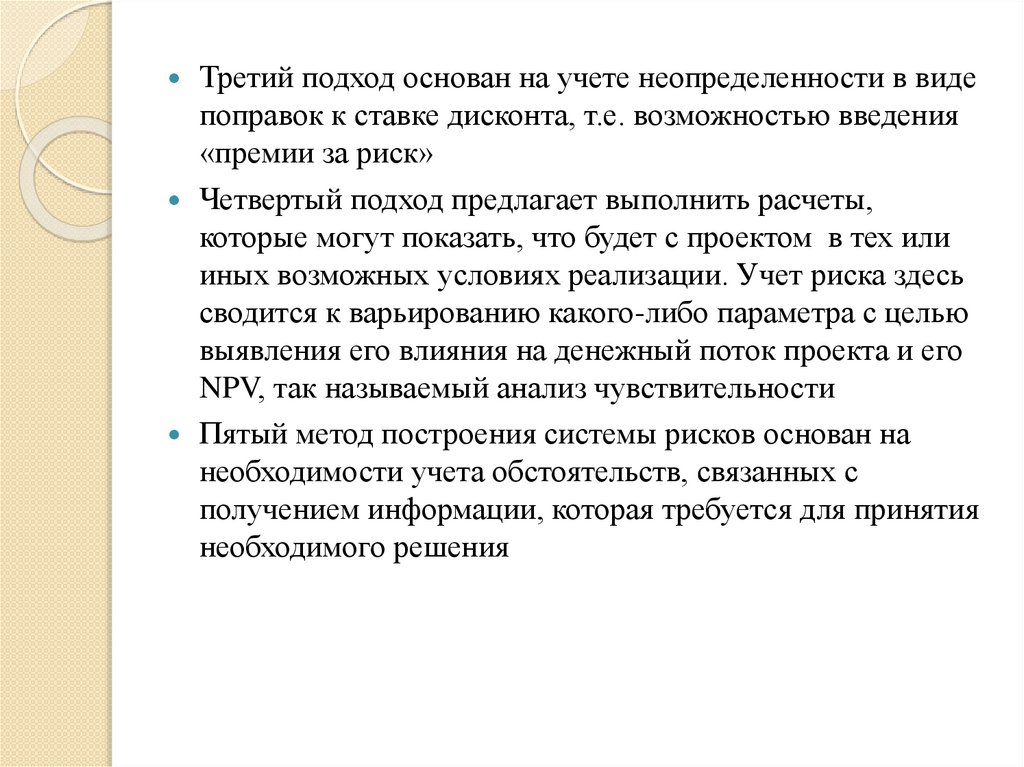 Третий подход основан на учете неопределенности в видепоправок к ставке дисконта, т.е. возможностью введения