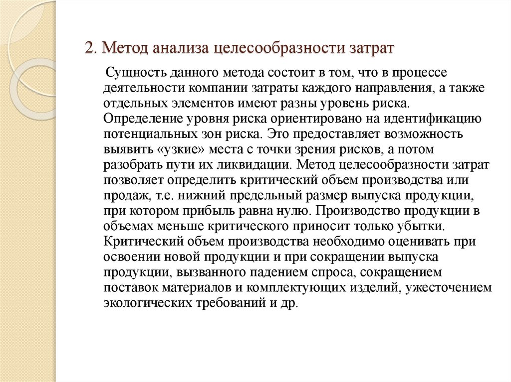 2. Метод анализа целесообразности затратСущность данного метода состоит в том, что в процессе