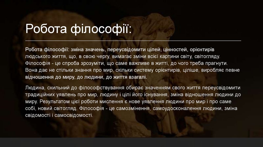 Робота філософії:Робота філософії: зміна значень, переусвідомити цілей, цінностей, орієнтирів