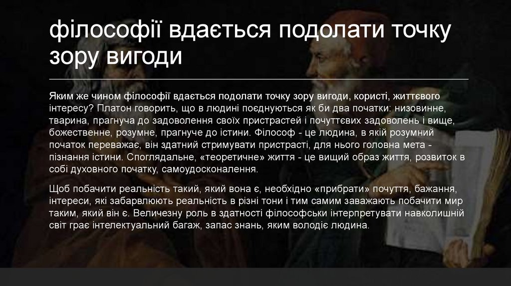 Яким же чином філософії вдається подолати точку зору вигоди, користі, життєвого