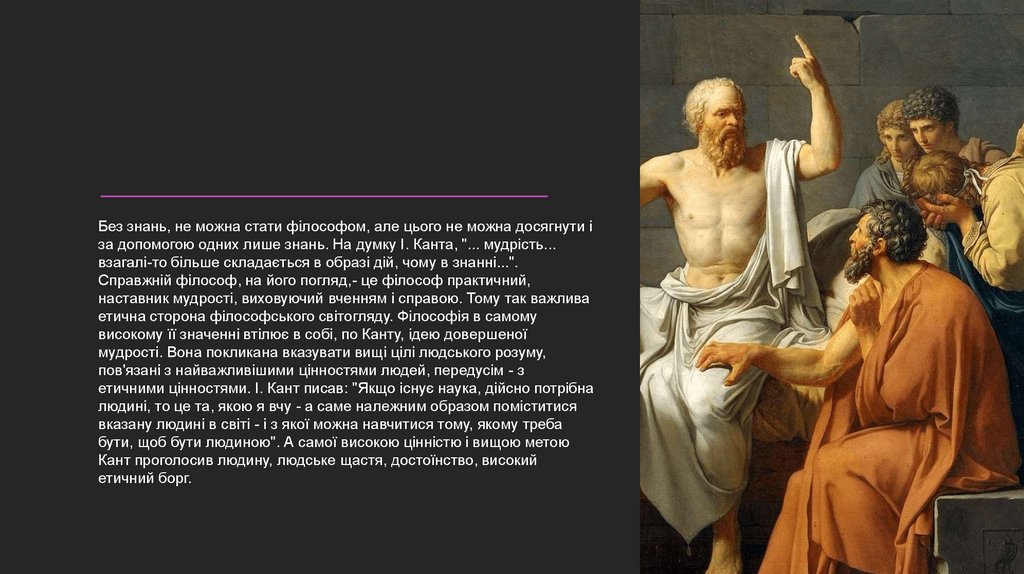 Без знань, не можна стати філософом, але цього не можна досягнути іза допомогою одних лише знань. На думку І. Канта, "... мудрість...