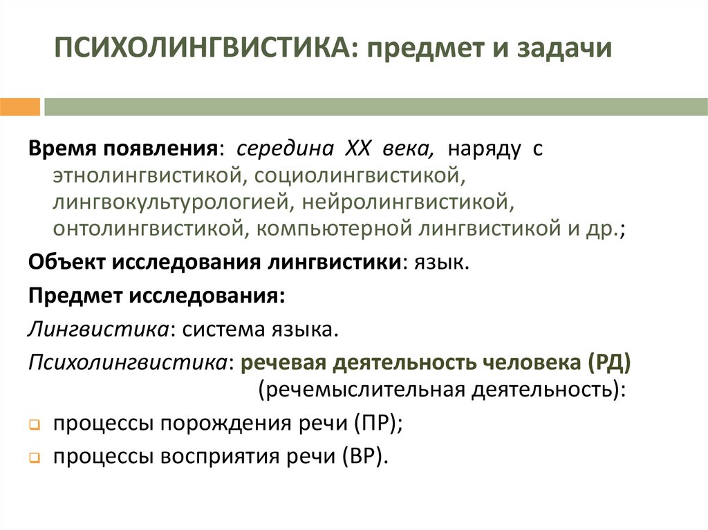 ПСИХОЛИНГВИСТИКА: предмет и задачиВремя появления: середина ХХ века, наряду с