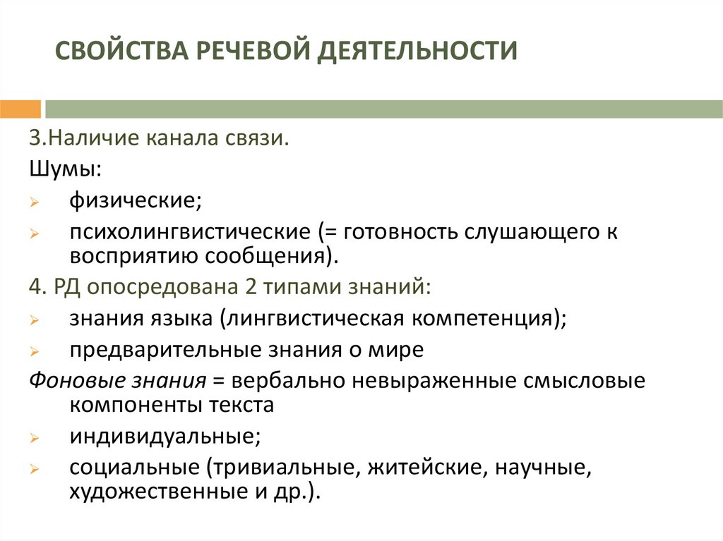 СВОЙСТВА РЕЧЕВОЙ ДЕЯТЕЛЬНОСТИ3.Наличие канала связи.