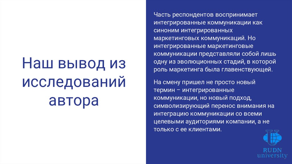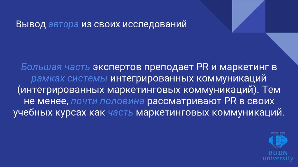 Вывод автора из своих исследованийБольшая часть экспертов преподает PR и маркетинг в
