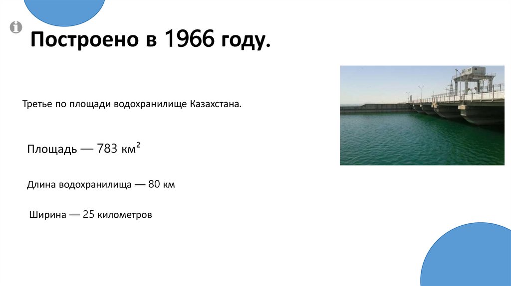 Построено в 1966 году.Третье по площади водохранилище Казахстана.