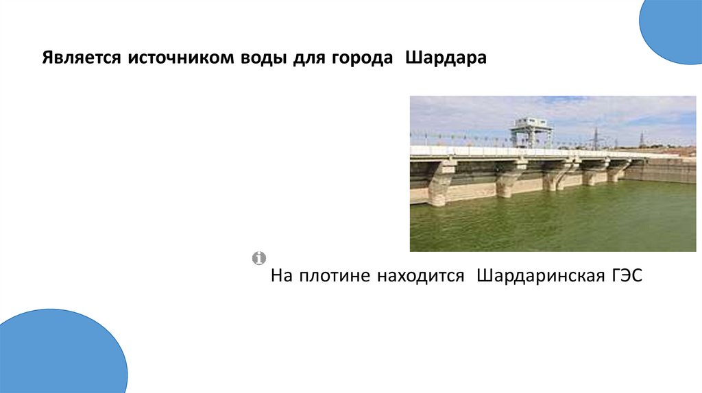 Является источником воды для города ШардараНа плотине находится Шардаринская ГЭС