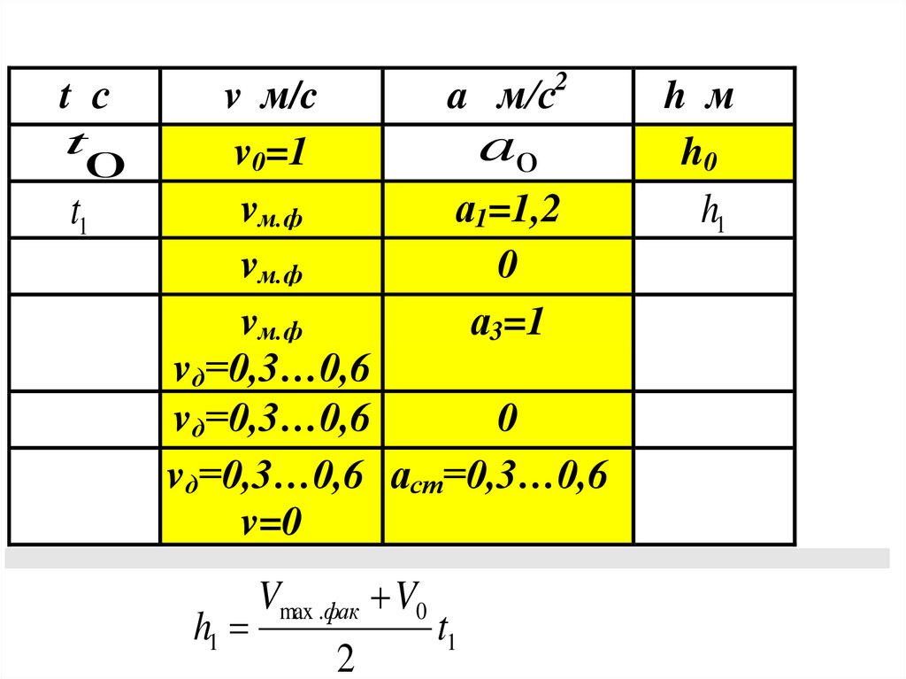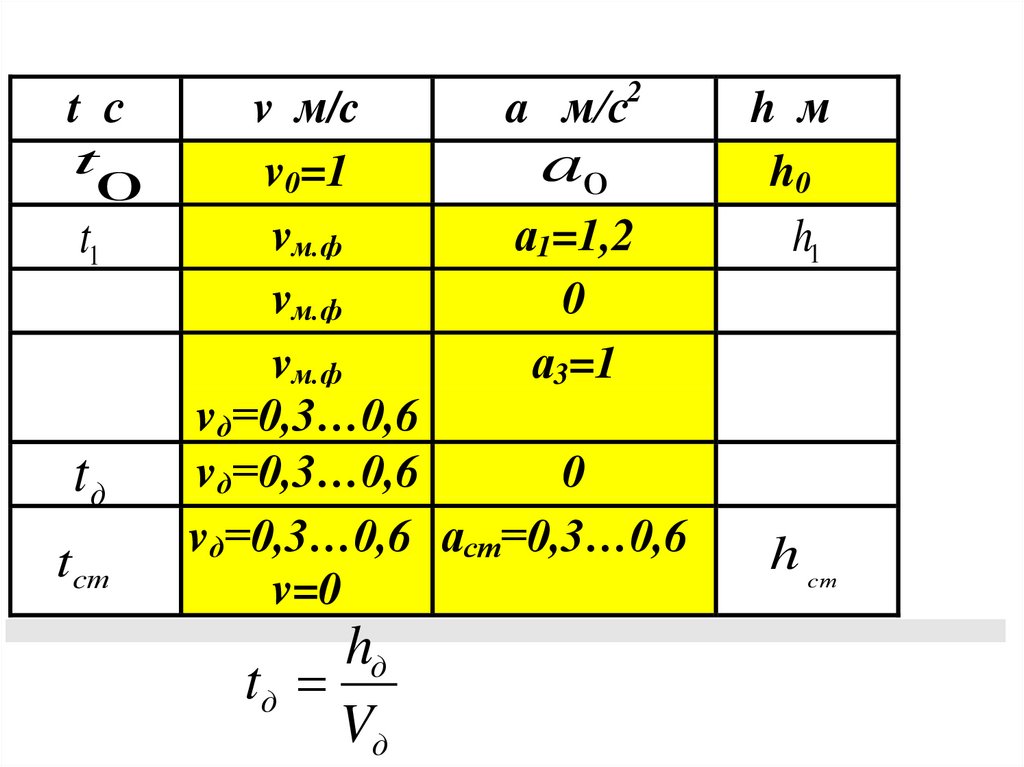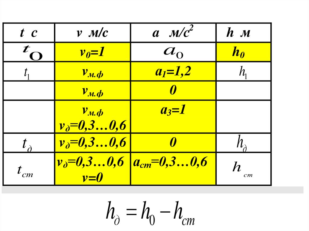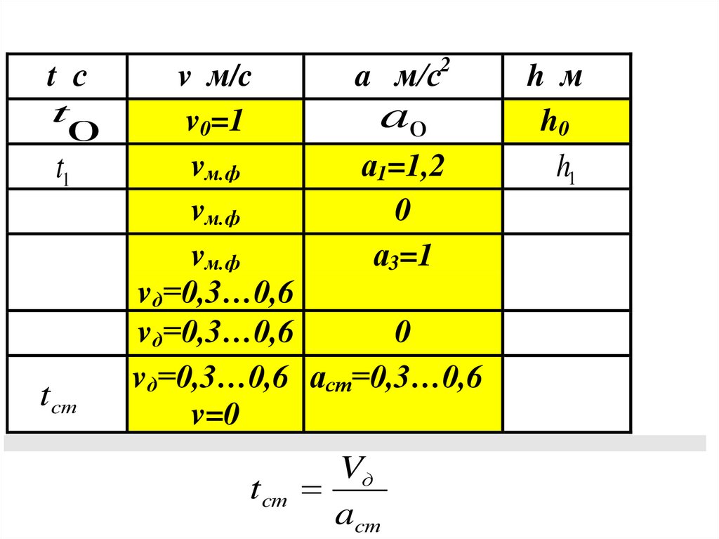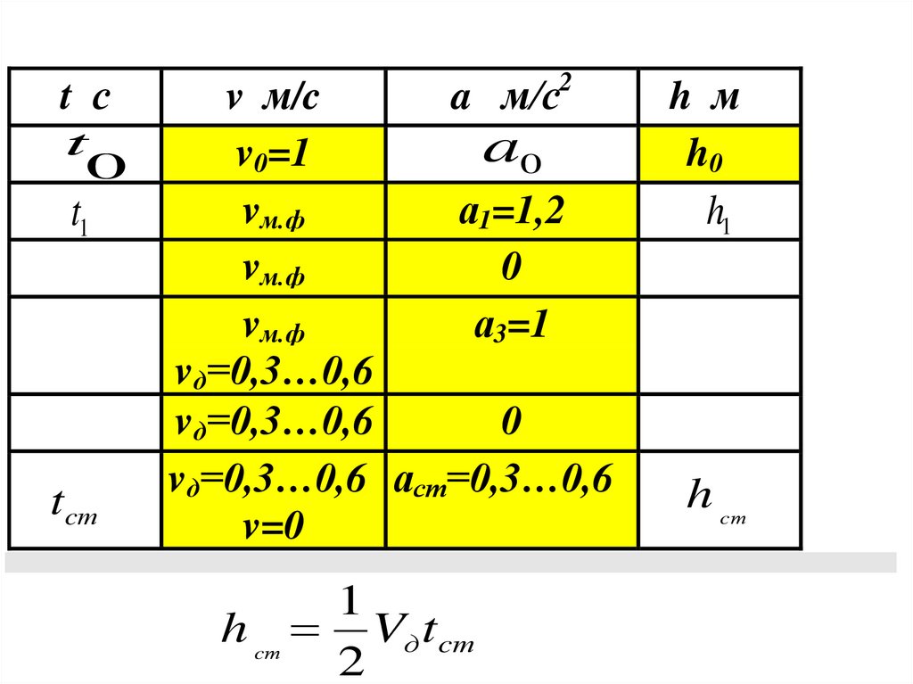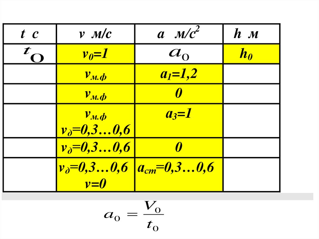 При изучении кинематики ПУ будем рассматривать величины: V- скорость движения сосуда,а - ускорение сосуда, h - пройденный путь.