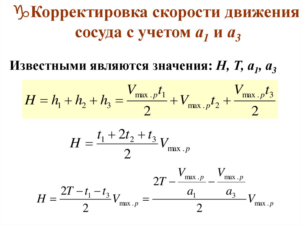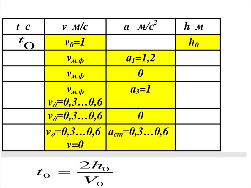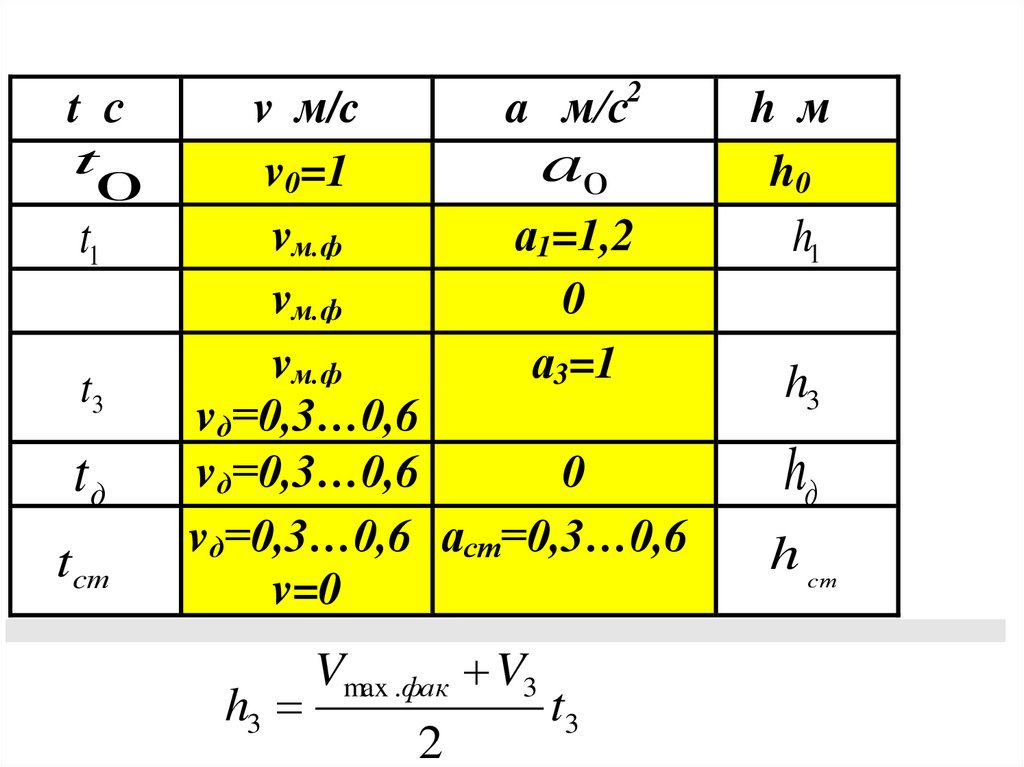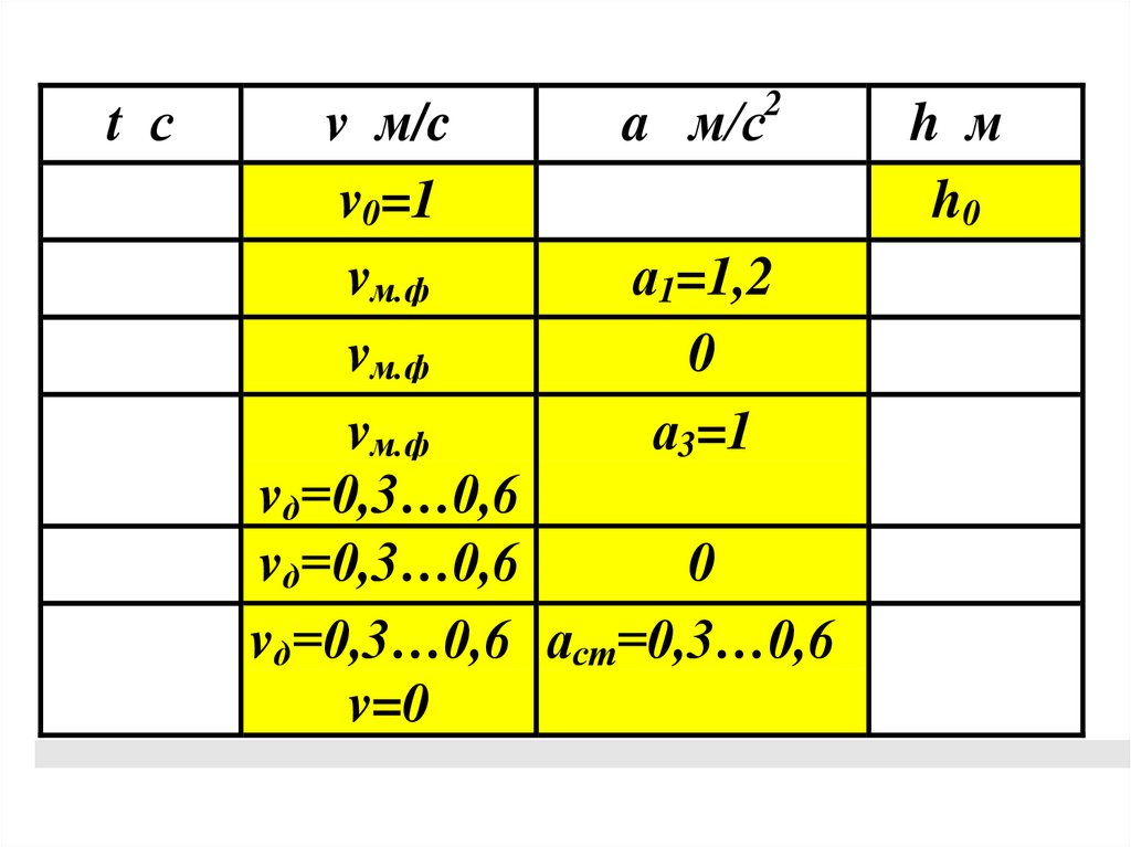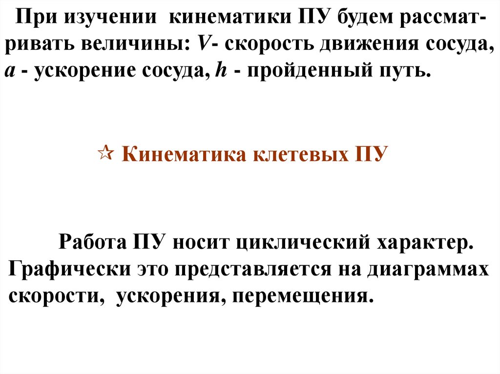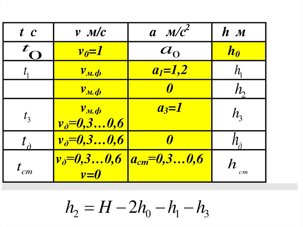 При изучении кинематики ПУ будем рассматривать величины: V- скорость движения сосуда,а - ускорение сосуда, h - пройденный путь.