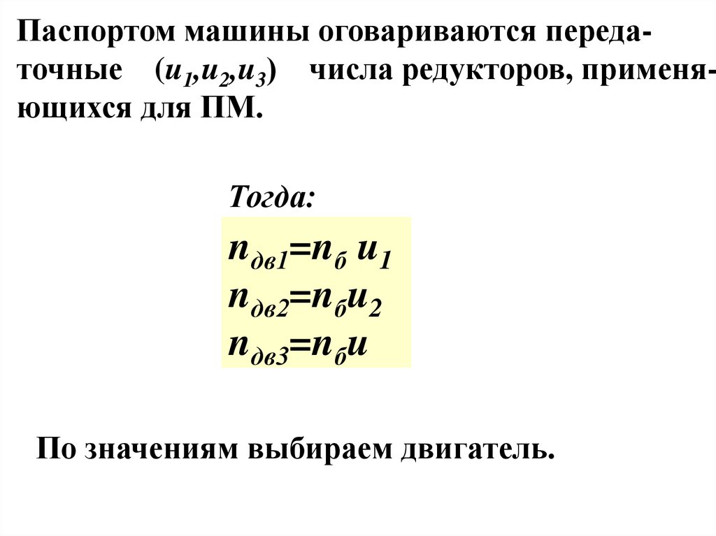 Паспортом машины оговариваются передаточные (u1,u2,u3) числа редукторов, применяющихся для ПМ.Тогда: