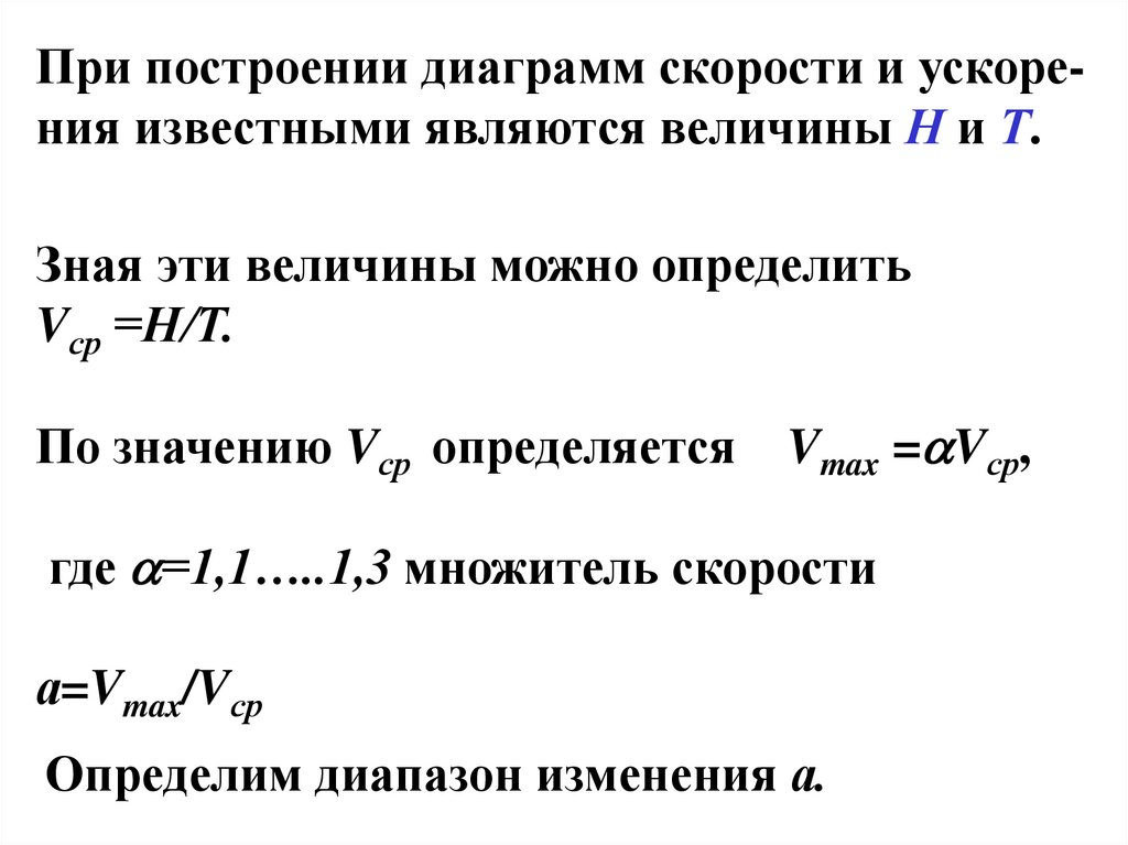 При построении диаграмм скорости и ускорения известными являются величины Н и Т.Зная эти величины можно определить