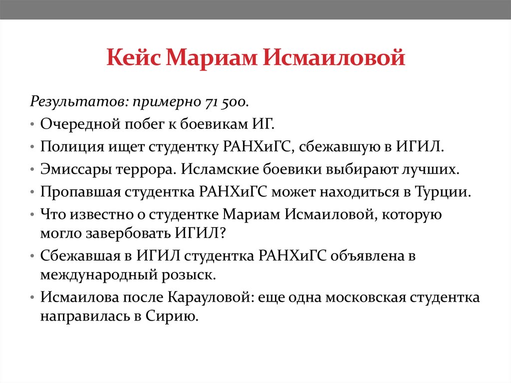 Кейс Мариам ИсмаиловойРезультатов: примерно 71 500.