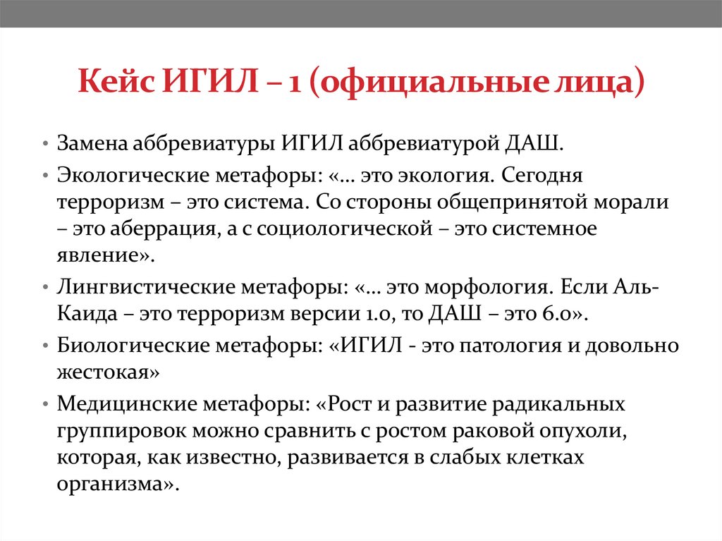 • Лингвистические метафоры: «… это морфология. Если АльКаида – это терроризм версии 1.0, то ДАШ – это 6.0».