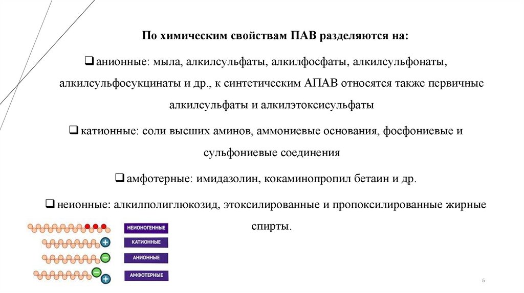 По химическим свойствам ПАВ разделяются на:анионные: мыла, алкилсульфаты, алкилфосфаты, алкилсульфонаты,