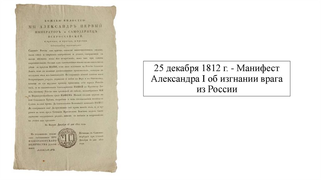 25 декабря 1812 г. - МанифестАлександра I об изгнании врага