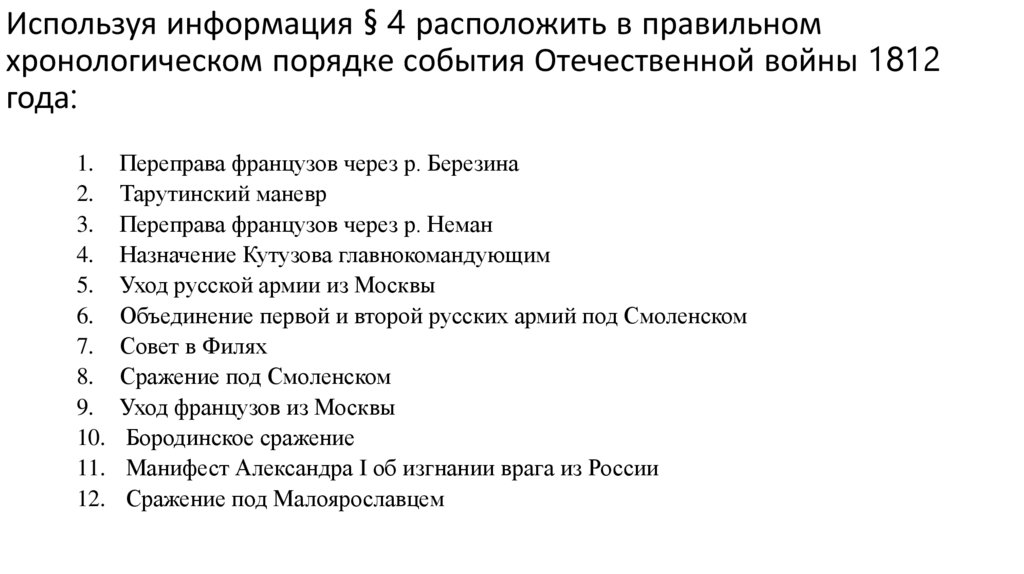 Используя информация § 4 расположить в правильномхронологическом порядке события Отечественной войны 1812