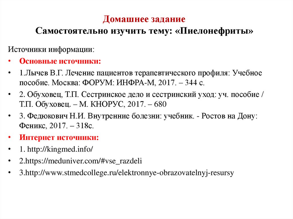 Домашнее заданиеСамостоятельно изучить тему: «Пиелонефриты»