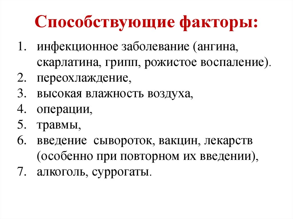 Способствующие факторы:1. инфекционное заболевание (ангина,