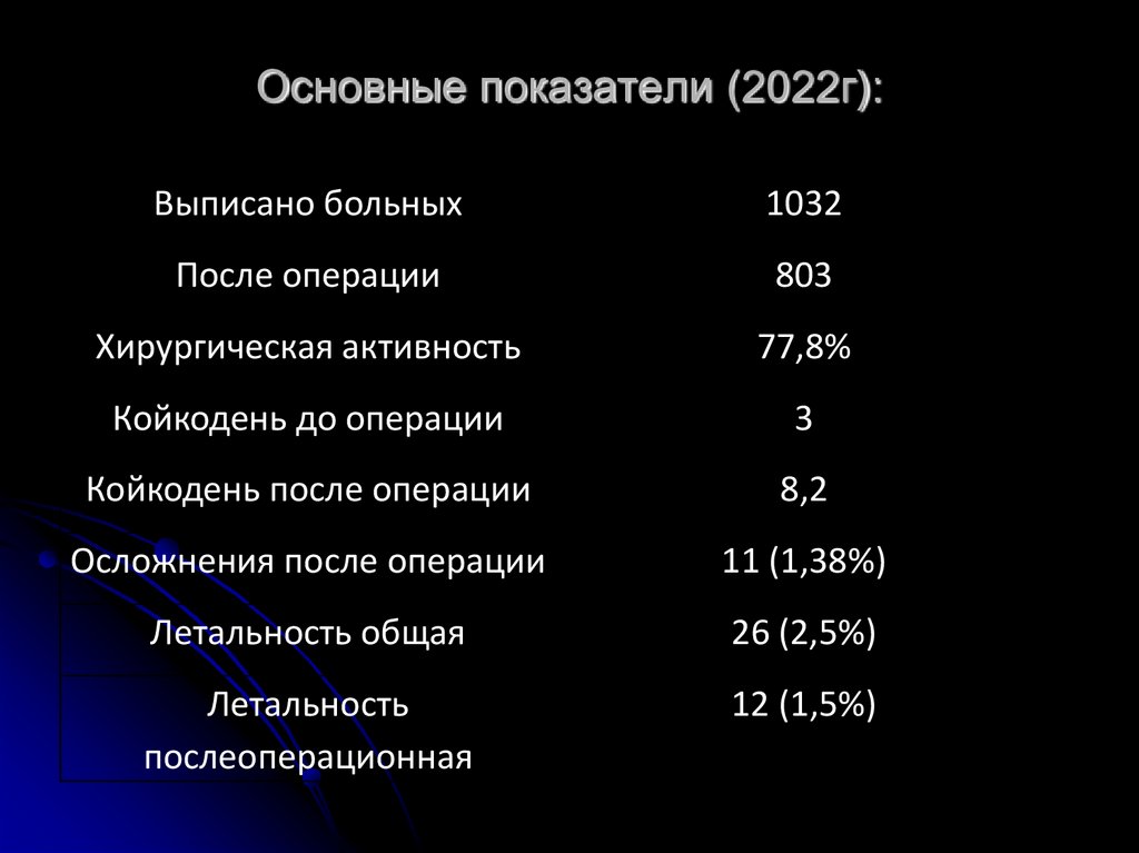 Основные показатели (2022г):Выписано больных