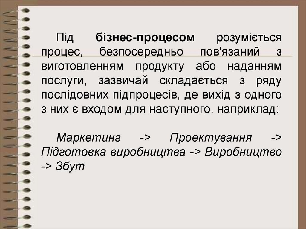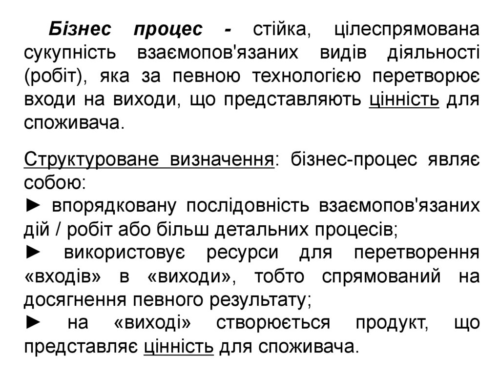 Бізнес процес - стійка, цілеспрямованасукупність взаємопов'язаних видів діяльності