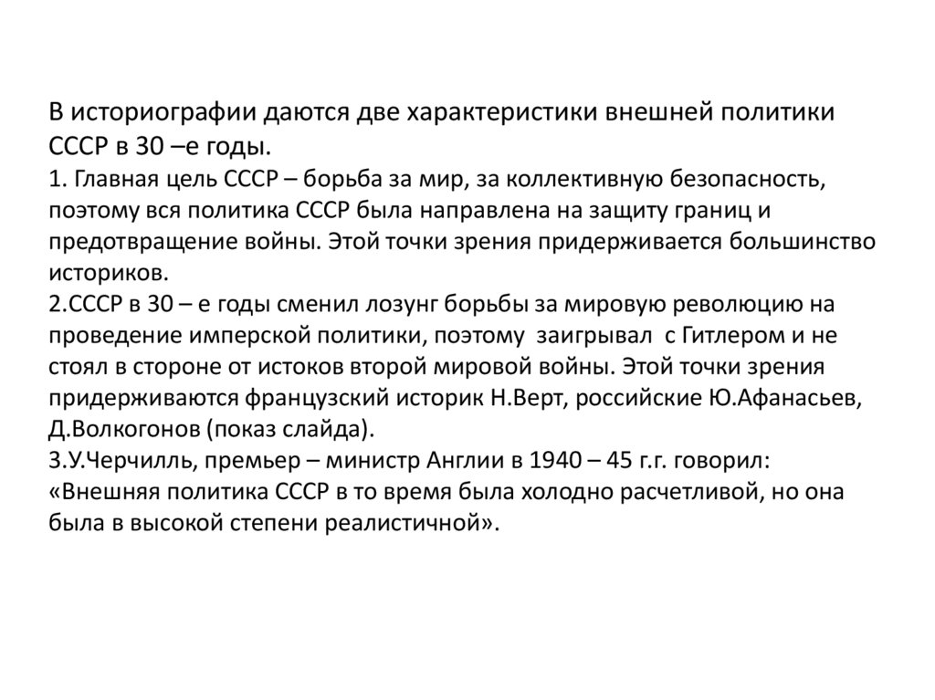 В историографии даются две характеристики внешней политикиСССР в 30 –е годы.