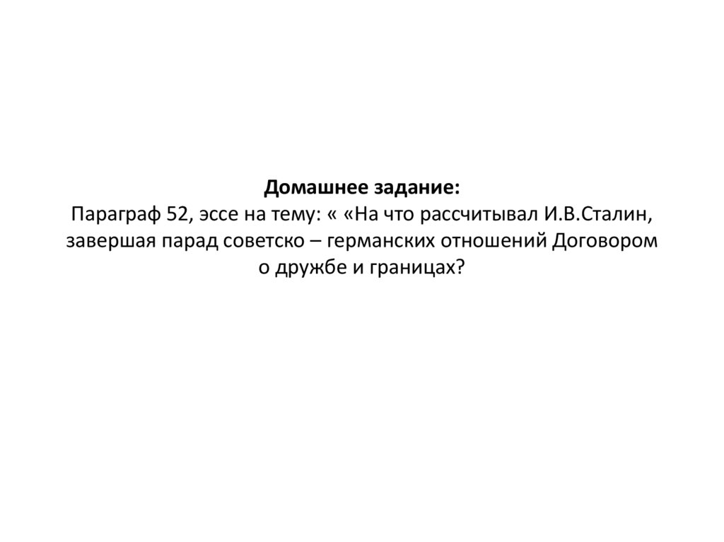 Домашнее задание:Параграф 52, эссе на тему: « «На что рассчитывал И.В.Сталин,