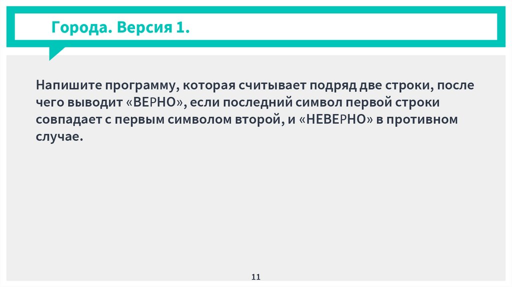 совпадает с первым символом второй, и «НЕВЕРНО» в противном