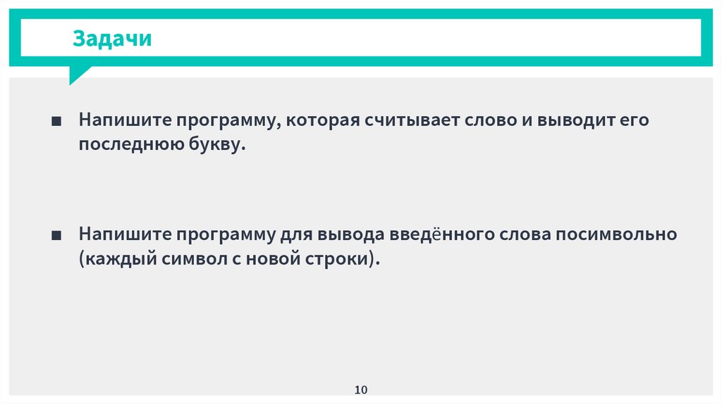 Задачи■ Напишите программу, которая считывает слово и выводит его