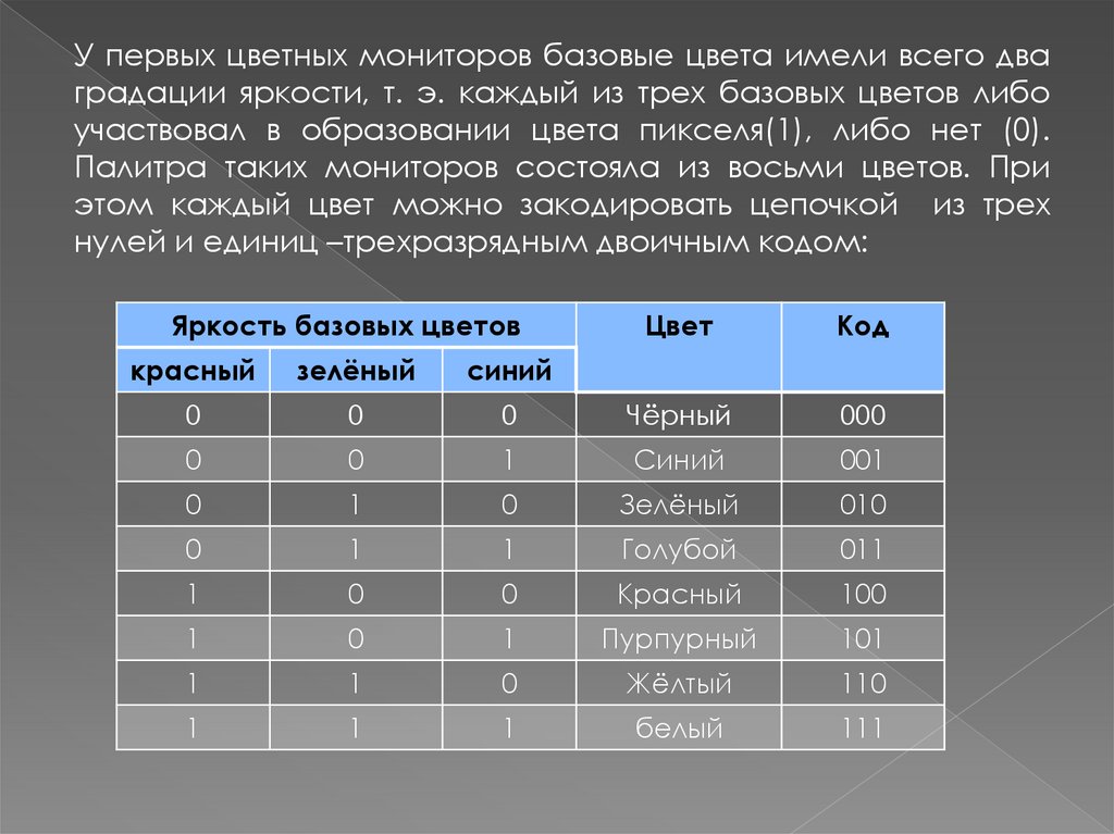 У первых цветных мониторов базовые цвета имели всего дваградации яркости, т. э. каждый из трех базовых цветов либо
