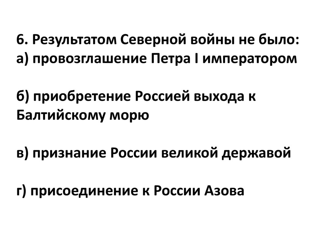 6. Результатом Северной войны не было:а) провозглашение Петра I императором