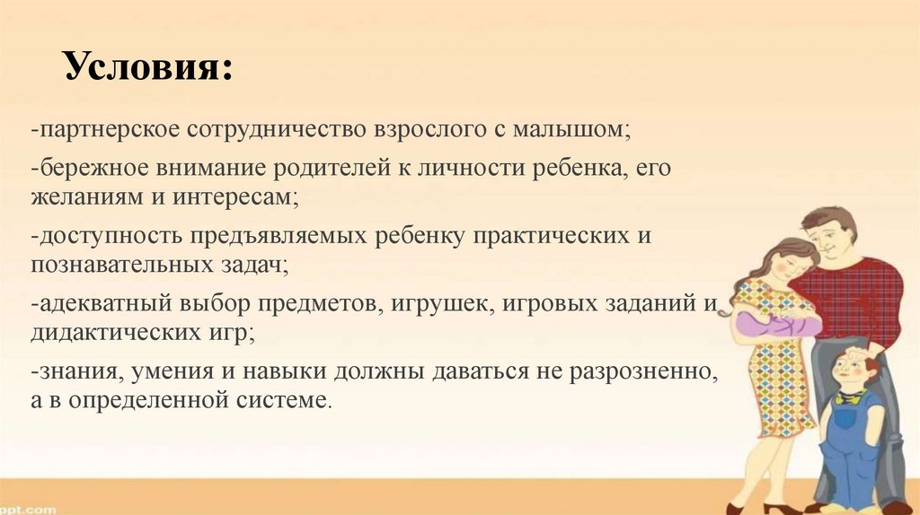Условия:-партнерское сотрудничество взрослого с малышом;