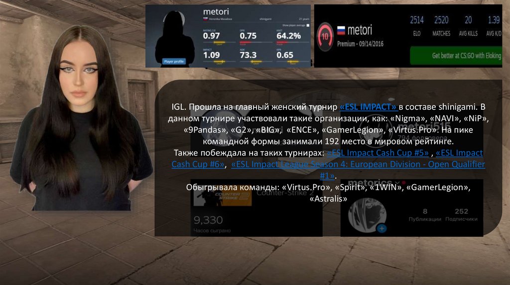 IGL. Прошла на главный женский турнир «ESL IMPACT» в составе shinigami. В