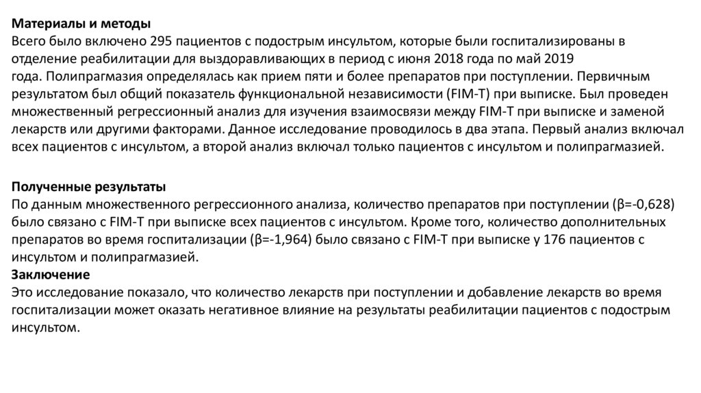 препаратов во время госпитализации (β=-1,964) было связано с FIM-T при выписке у 176 пациентов с