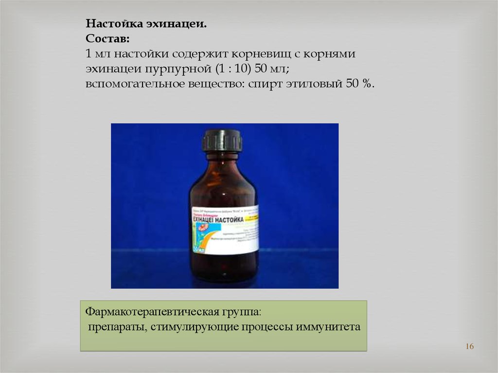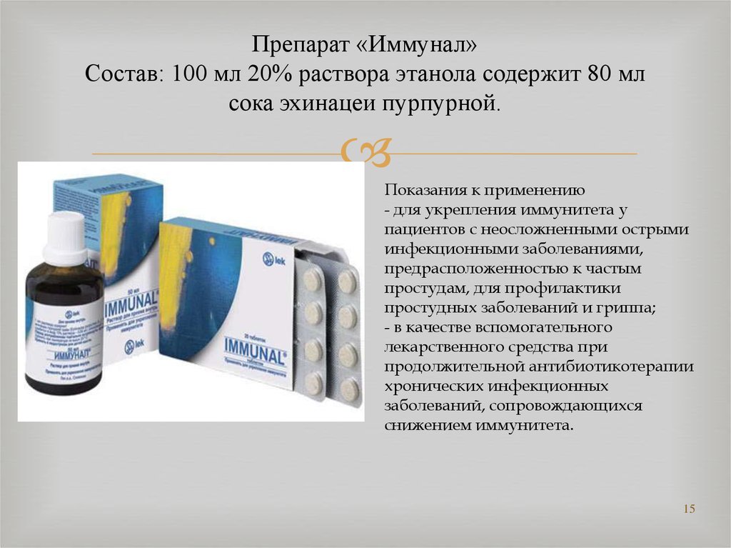 Препарат «Иммунал»Состав: 100 мл 20% раствора этанола содержит 80 мл