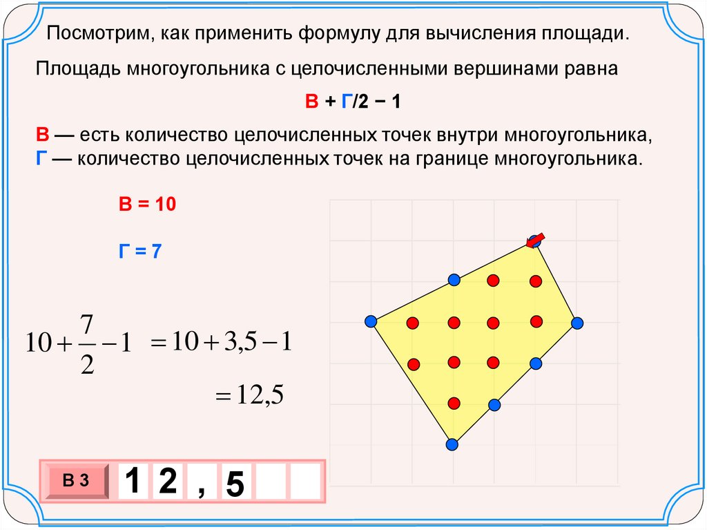Посмотрим, как применить формулу для вычисления площади.Площадь многоугольника с целочисленными вершинами равна
