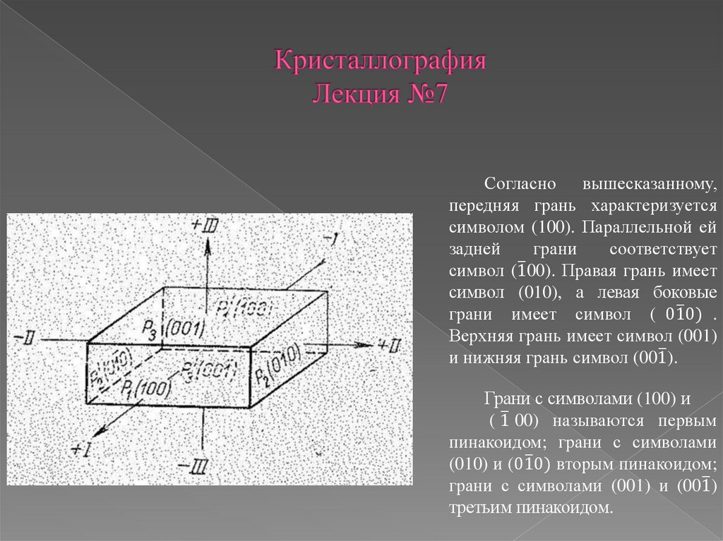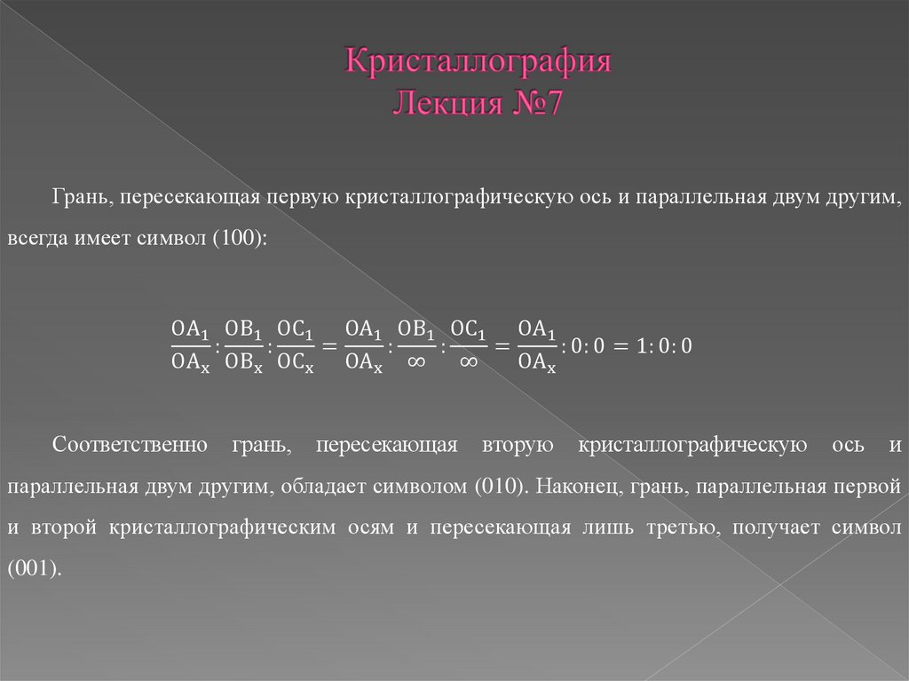 Грань, пересекающая первую кристаллографическую ось и параллельная двум другим,всегда имеет символ (100):