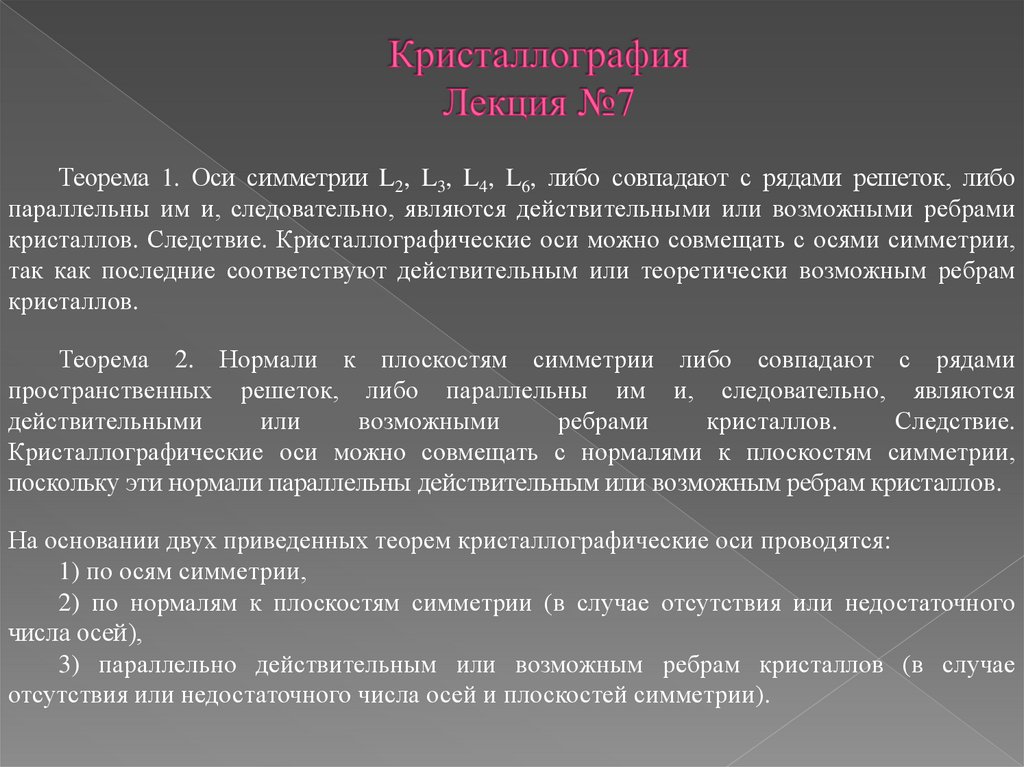 Теорема 1. Оси симметрии L2, L3, L4, L6, либо совпадают с рядами решеток, либопараллельны им и, следовательно, являются действительными или возможными ребрами