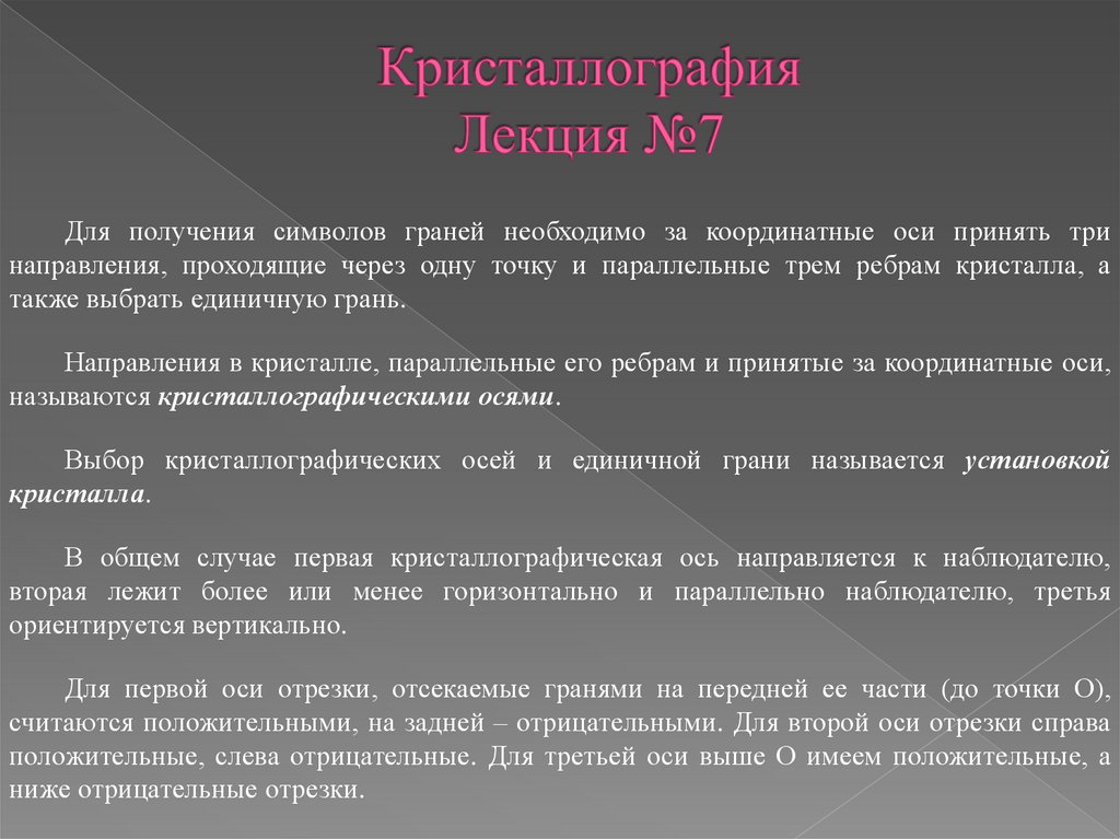 Для получения символов граней необходимо за координатные оси принять тринаправления, проходящие через одну точку и параллельные трем ребрам кристалла, а