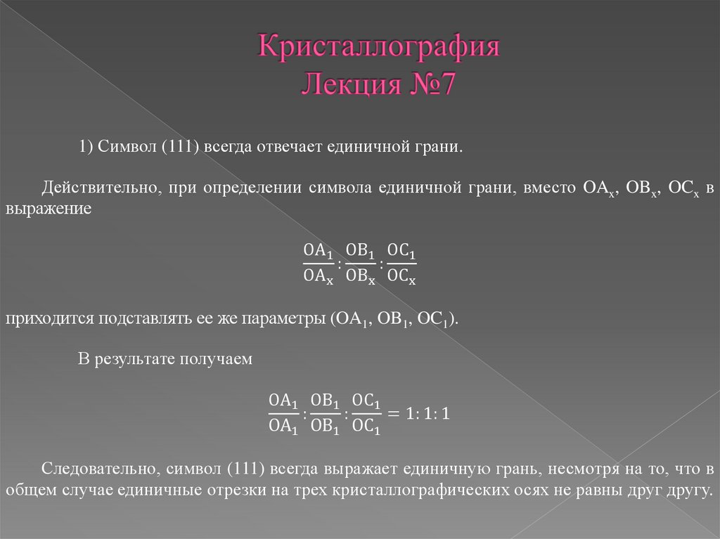 1) Символ (111) всегда отвечает единичной грани.Действительно, при определении символа единичной грани, вместо OAx, OBx, OCx в