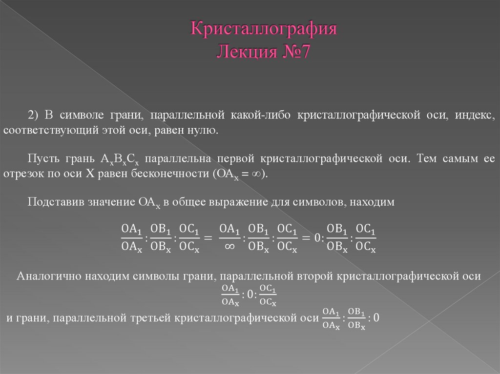 2) В символе грани, параллельной какой-либо кристаллографической оси, индекс,соответствующий этой оси, равен нулю.