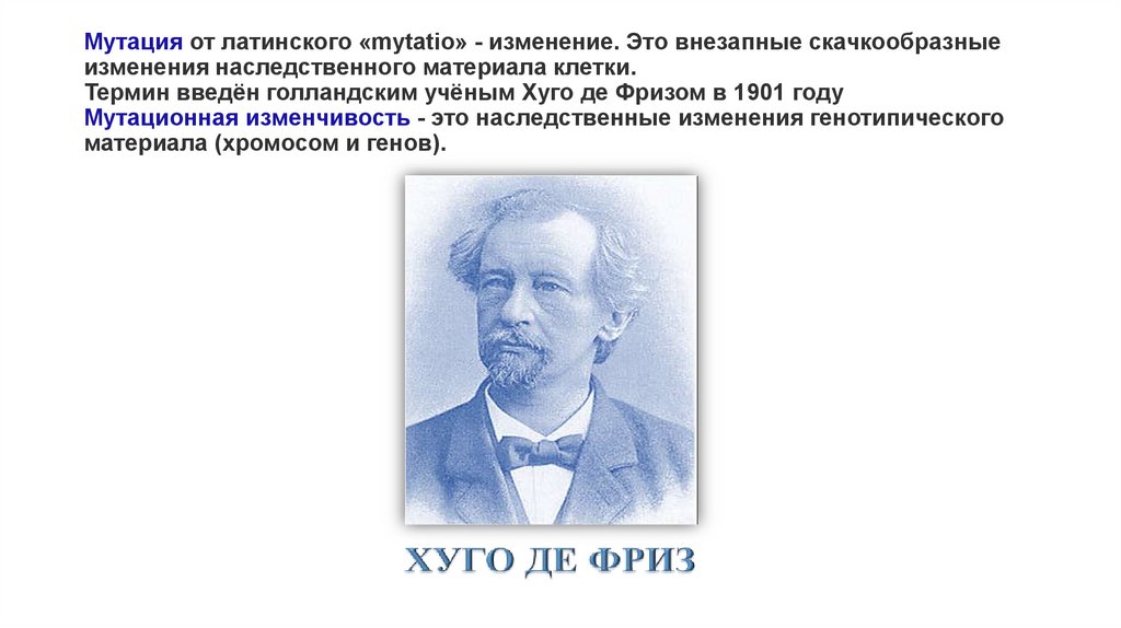 Мутация от латинского «mytatio» - изменение. Это внезапные скачкообразныеизменения наследственного материала клетки.