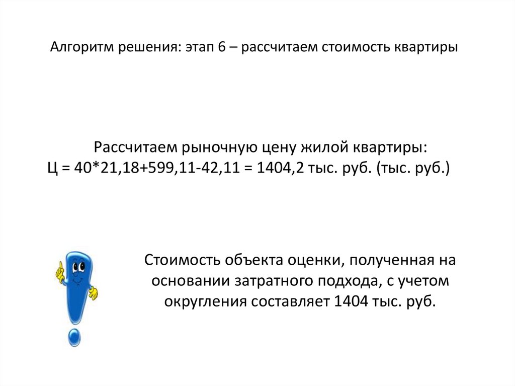 Алгоритм решения: этап 6 – рассчитаем стоимость квартирыРассчитаем рыночную цену жилой квартиры: