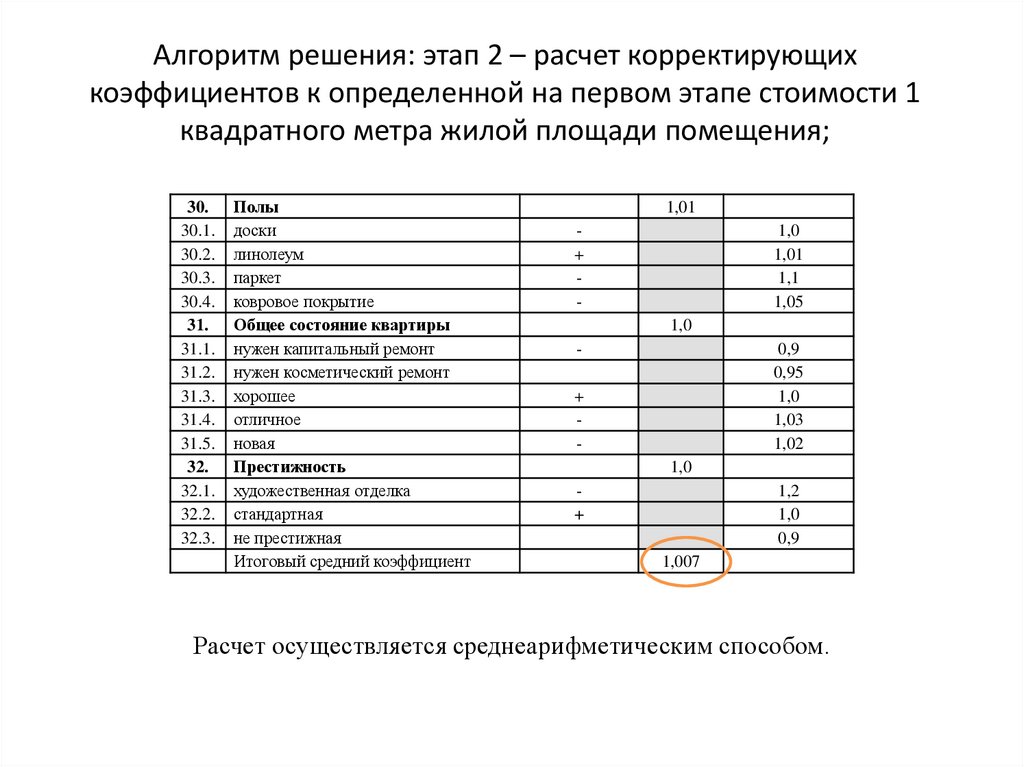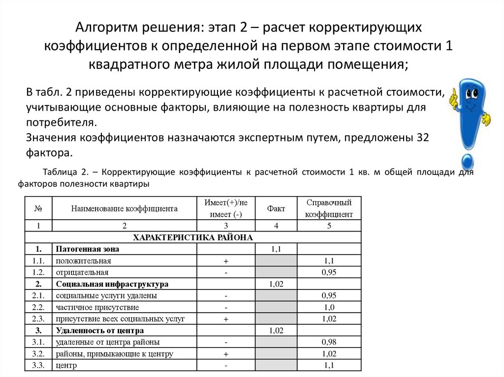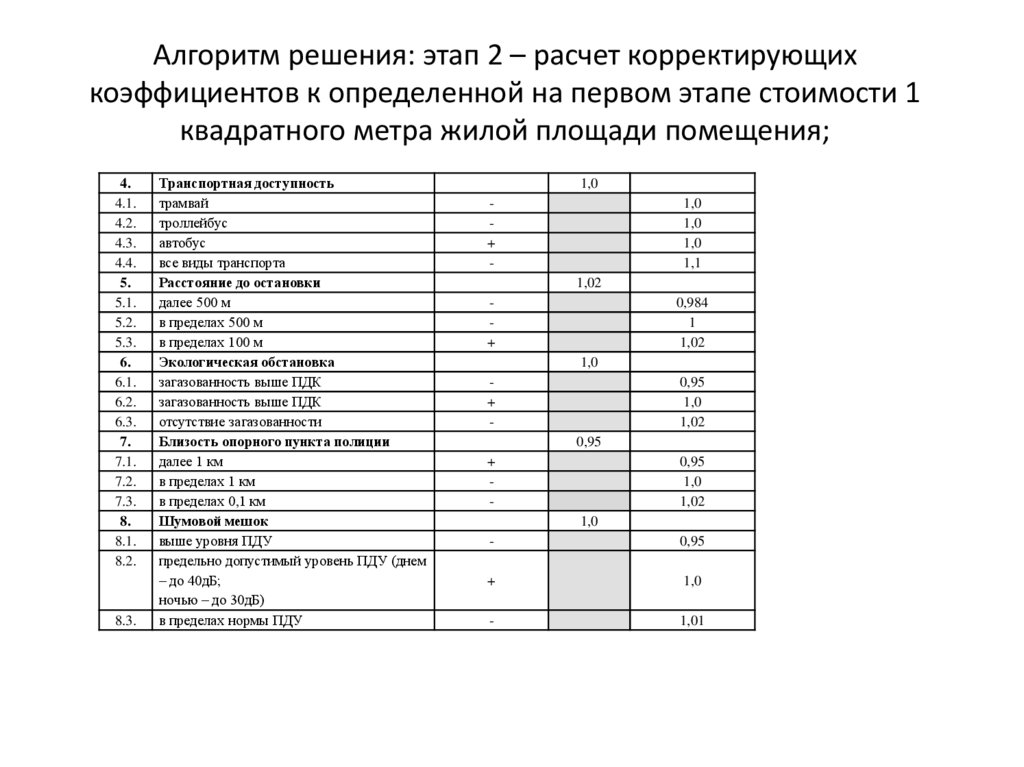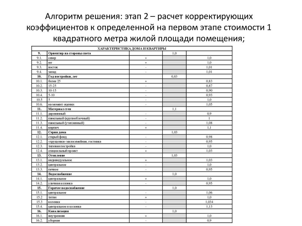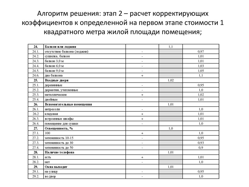 Алгоритм решения: этап 2 – расчет корректирующихкоэффициентов к определенной на первом этапе стоимости 1