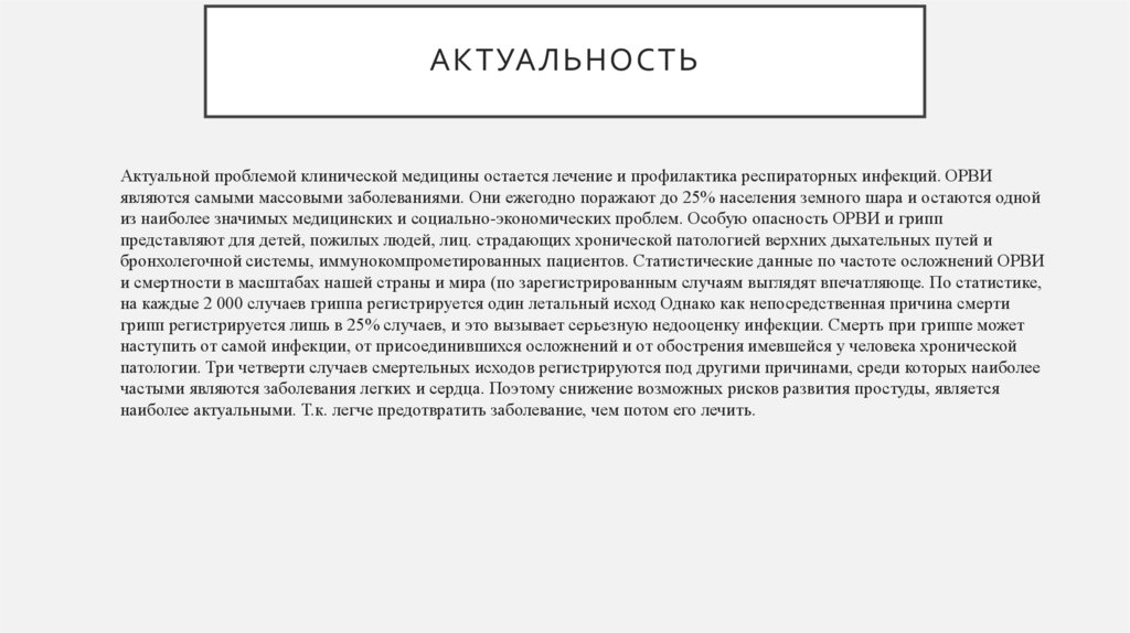 АКТУАЛЬНОСТЬАктуальной проблемой клинической медицины остается лечение и профилактика респираторных инфекций. ОРВИ
