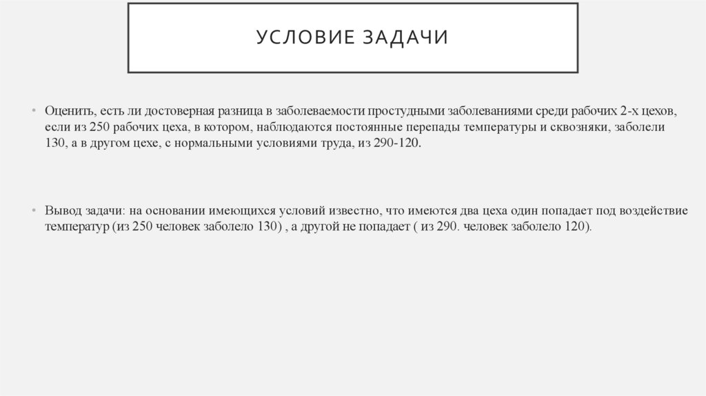 УСЛОВИЕ ЗАДАЧИ• Оценить, есть ли достоверная разница в заболеваемости простудными заболеваниями среди рабочих 2-х цехов,