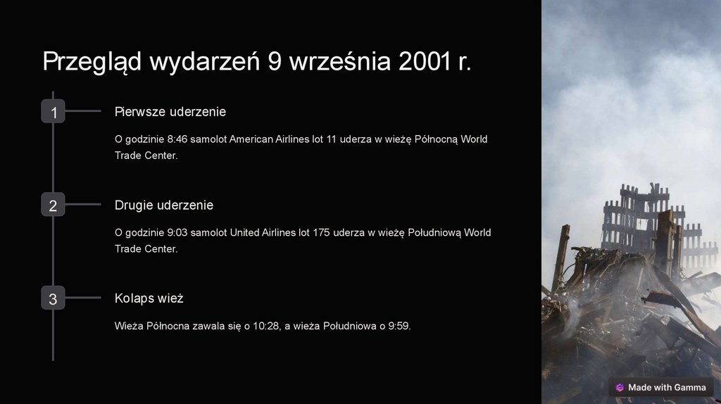 O godzinie 8:46 samolot American Airlines lot 11 uderza w wieżę Północną World