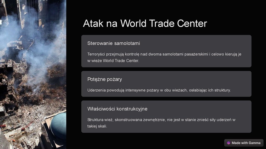 Uderzenia powodują intensywne pożary w obu wieżach, osłabiając ich struktury.