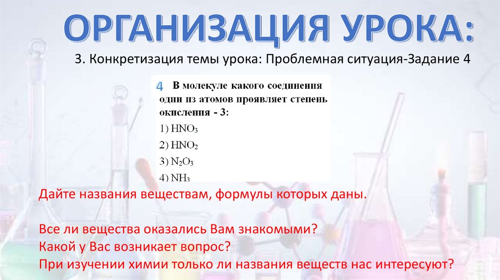 3. Конкретизация темы урока: Проблемная ситуация-Задание 4Дайте названия веществам, формулы которых даны.